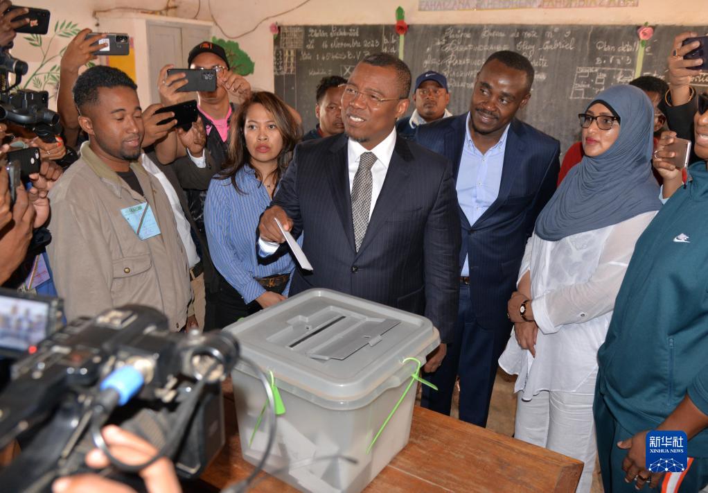 11月16日,在馬達加斯加首都塔那那利佛,總統選舉候選人希特尼在投票站進(jìn)行投票。
