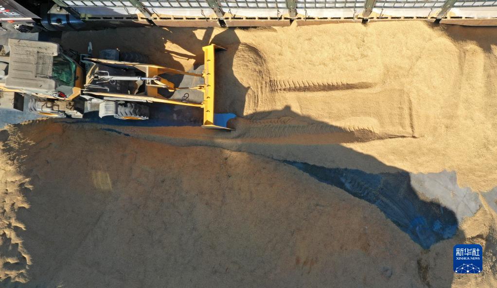 11月16日,工人駕駛鏟車(chē)在遼寧省臺安縣鼎強糧米加工廠(chǎng)曬場(chǎng)內運載稻谷(無(wú)人機照片)。