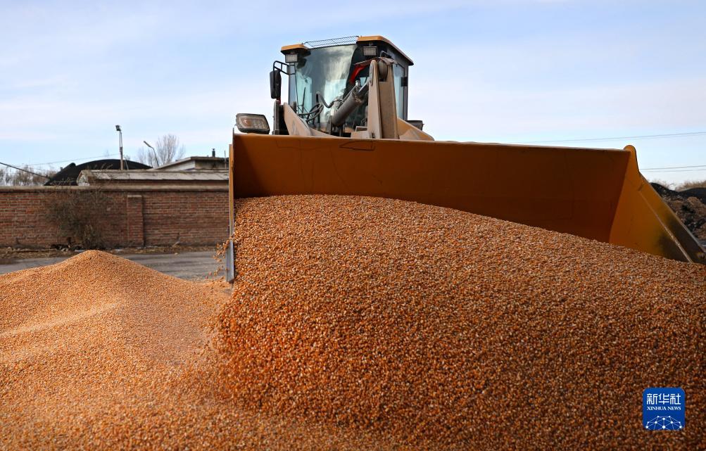 11月16日,工人駕駛鏟車(chē)在遼寧省臺安縣桓洞鎮的一家糧庫內卸載玉米。