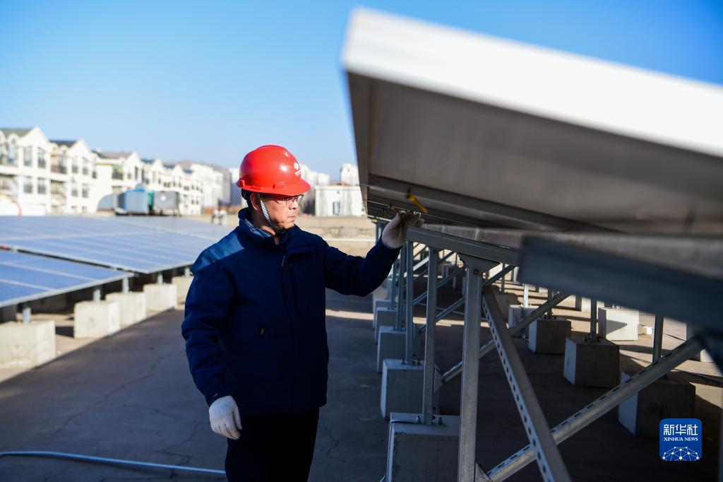 11月16日,工作人員在位于海勃灣區的烏海市第八中學(xué)餐廳屋頂檢查光伏設備。