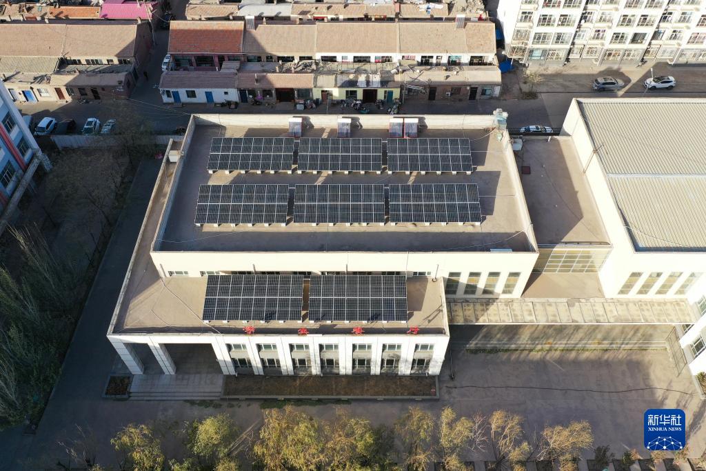 這是11月16日拍攝的位于海勃灣區的烏海市第八中學(xué)餐廳屋頂的光伏板(無(wú)人機照片)。