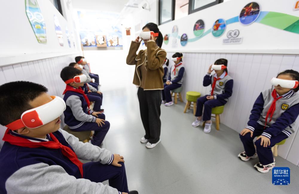 11月17日,在成都市迎賓路小學(xué)健康空間,健康老師帶領(lǐng)學(xué)生體驗眼睛按摩儀。