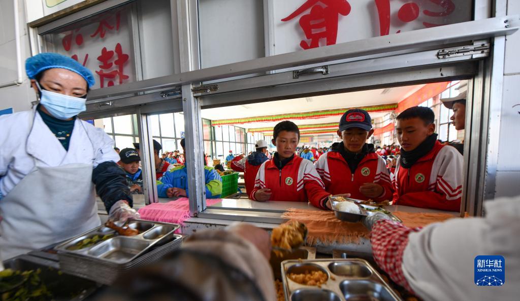 當雄縣中學(xué)的學(xué)生在學(xué)校食堂打午飯(11月10日攝)。