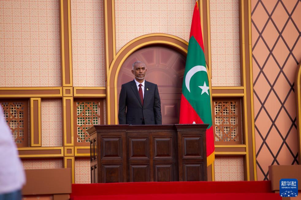 11月17日,馬爾代夫新任總統穆伊茲在首都馬累出席就職儀式。