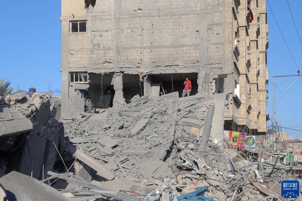 11月17日,在加沙地帶南部城市汗尤尼斯,一名男子查看遭以色列襲擊后的建筑廢墟。