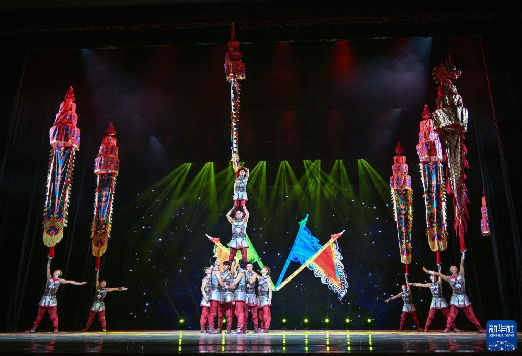 這是滄州雜技團、吳橋雜技學(xué)校帶來(lái)的雜技《龍躍神州——中幡》(11月17日攝)。