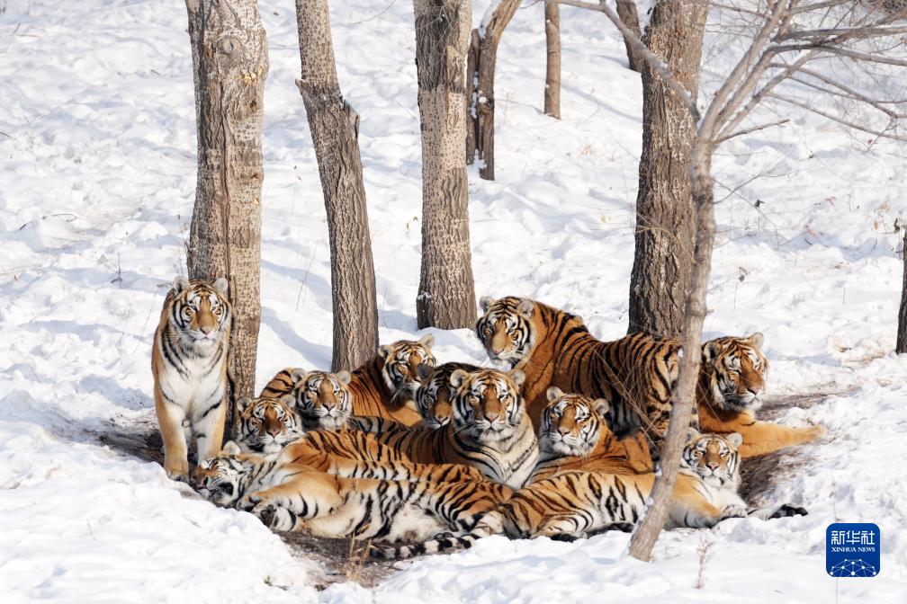 11月17日,在黑龍江東北虎林園散放區,一群東北虎在雪地上休息。