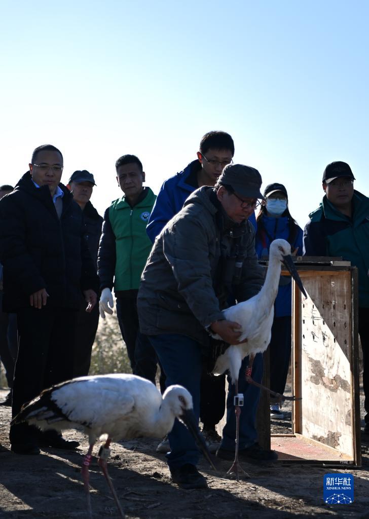 11月18日,工作人員打開(kāi)木門(mén)將東方白鸛放歸自然。