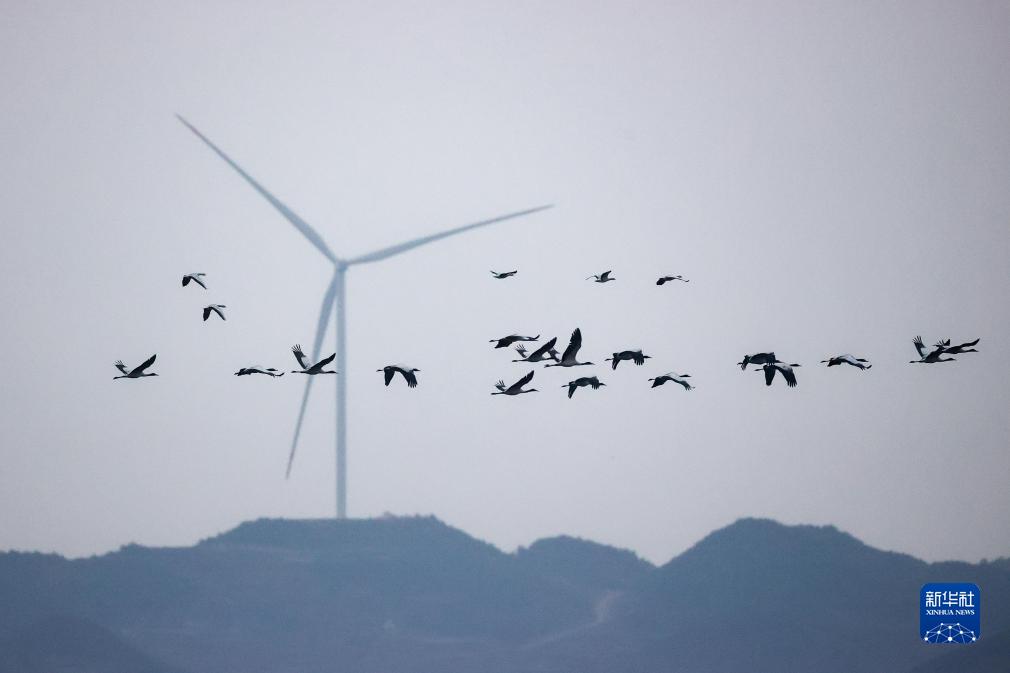 11月18日在貴州草海國家級自然保護區拍攝的黑頸鶴。