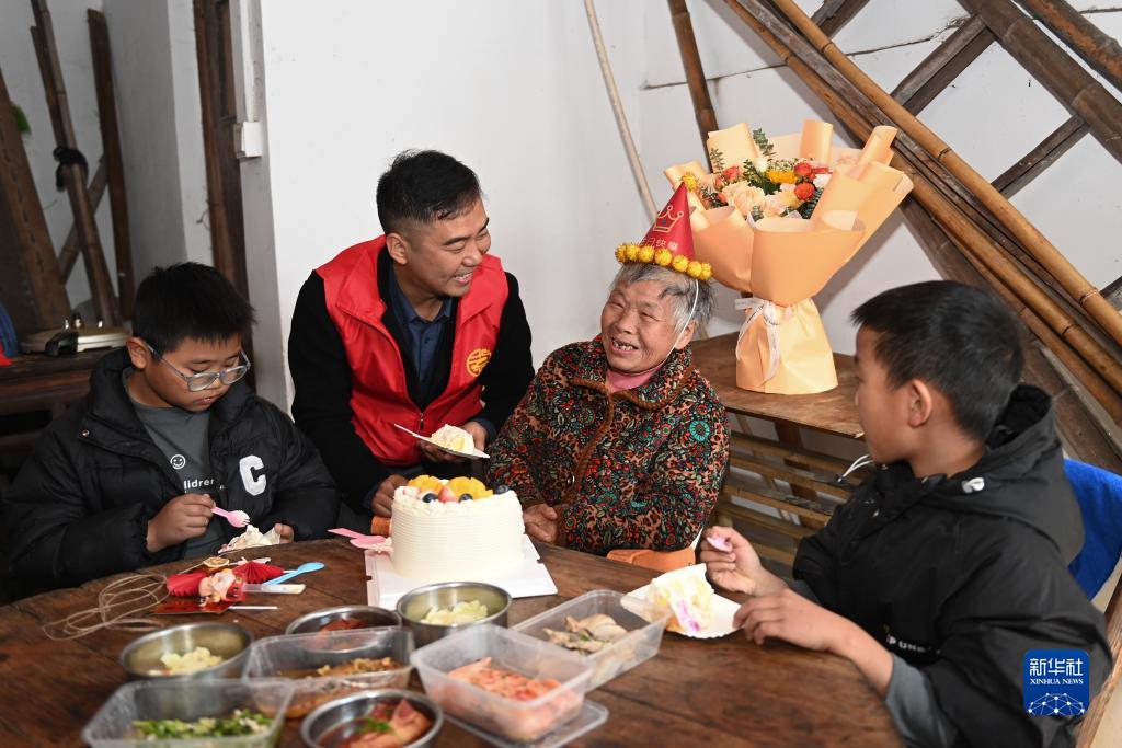 11月19日,在慈溪市白沙路街道隆興村,居家養老服務(wù)中心的志愿者為74歲的低保獨居老人盧鳳娣提供送餐服務(wù),并為老人祝賀生日。慈溪市全面實(shí)施、推進(jìn)老年助餐服務(wù)“倍增”計劃,目前每日助餐服務(wù)7000余人次,覆蓋全市所有村(社區)。