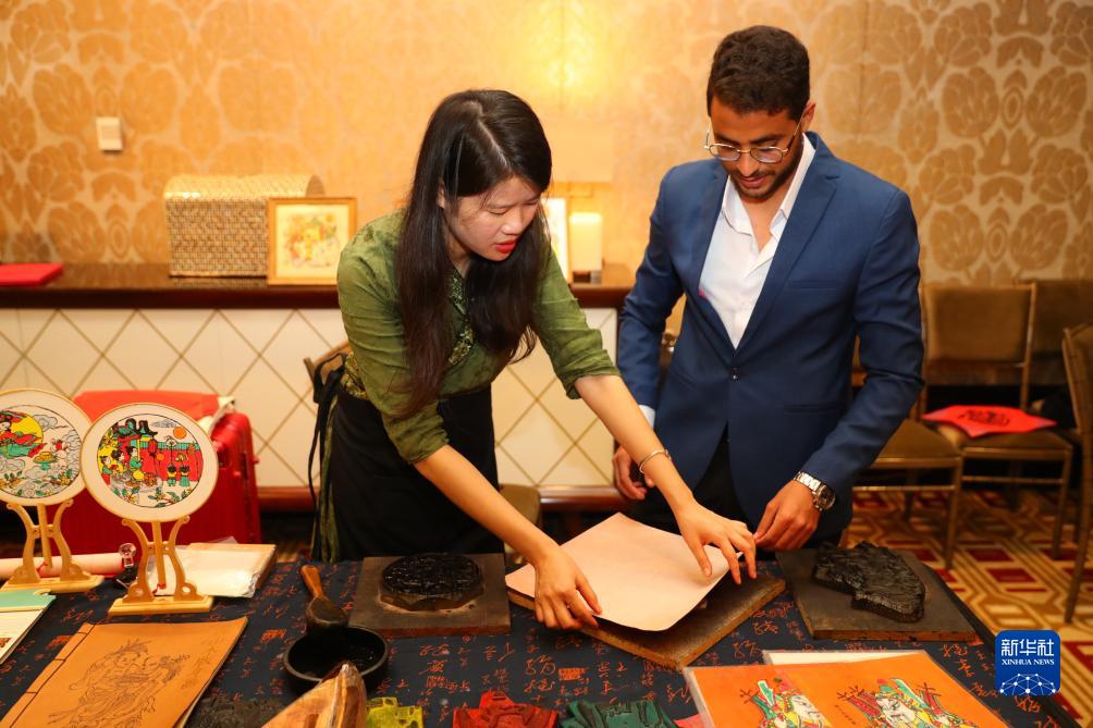 11月19日,在埃及開(kāi)羅舉行的粵港澳大灣區世界級旅游目的地推介暨“魅力廣東”視覺(jué)展上,一名男子在非遺展區體驗木板年畫(huà)制作。
