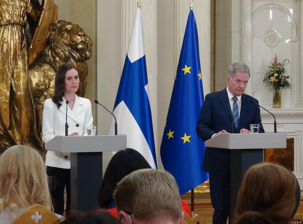 5月15日,在芬蘭赫爾辛基,芬蘭總統尼尼斯托(右)和總理馬林參加聯(lián)合記者會(huì )。(新華社記者陳靜攝)